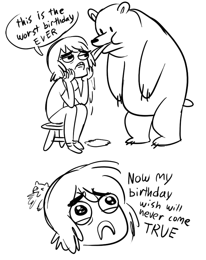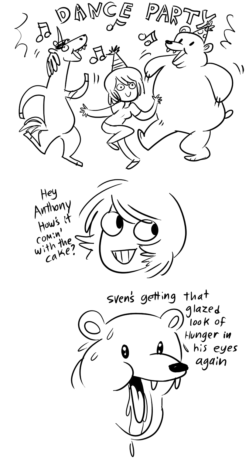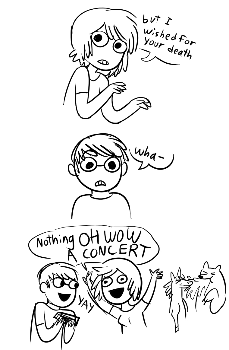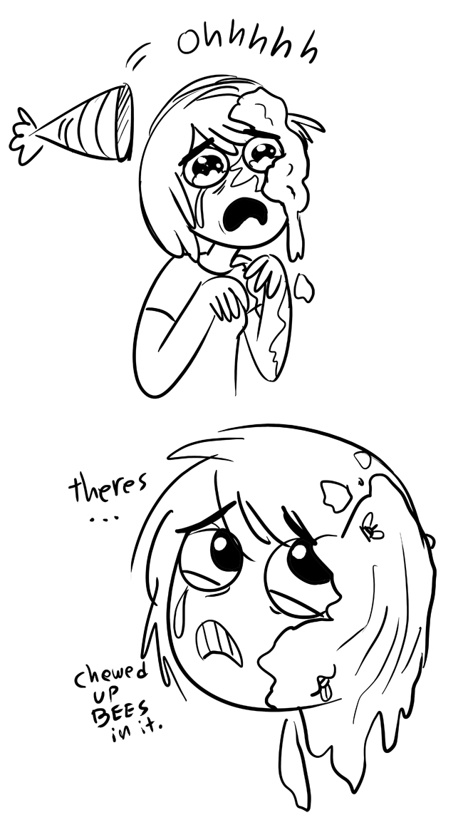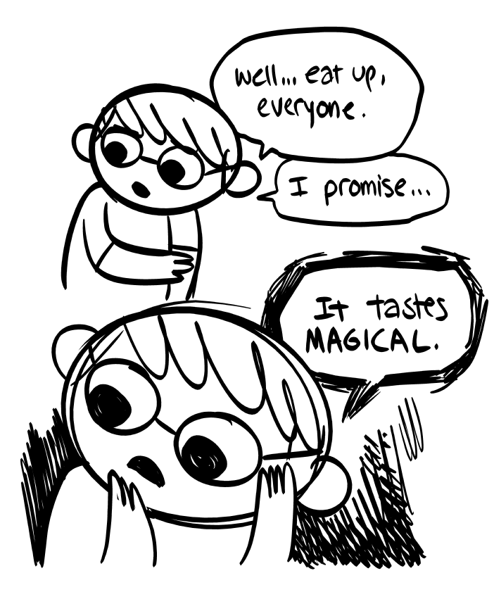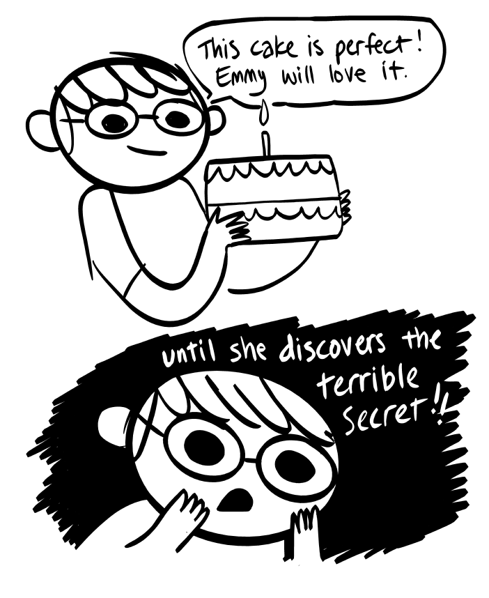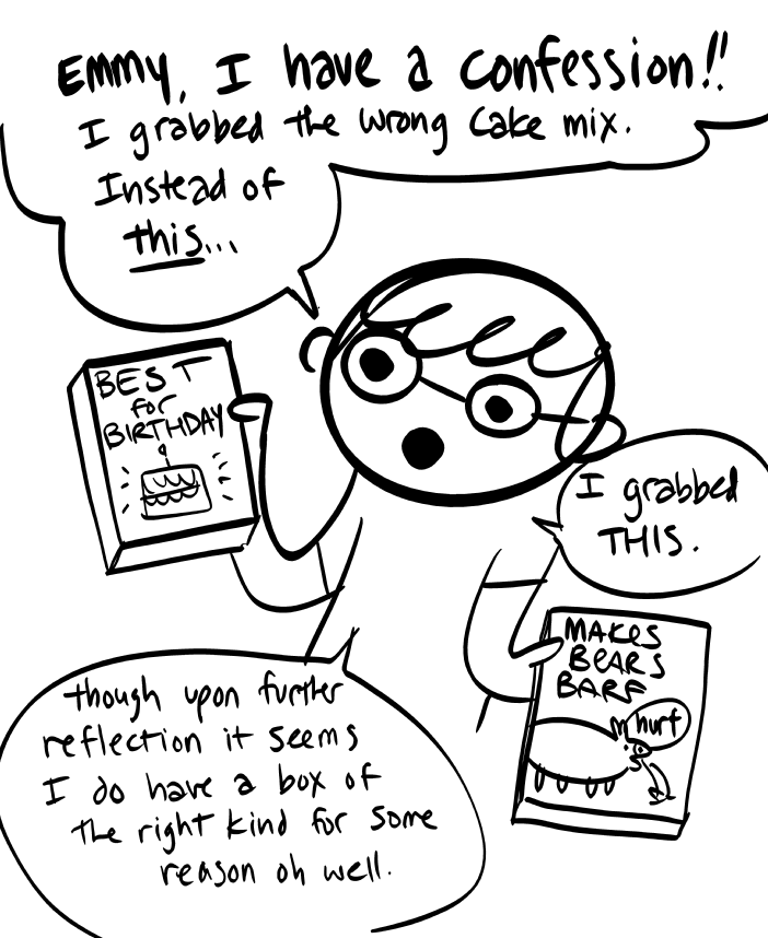 Images bordered in girly-girl pink were drawn by Emmy as she giggled and drank tea, while panels bordered in macho manly blue were drawn by me, clenching the pen in my monster-truck-like fist.