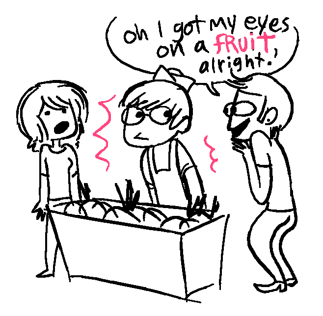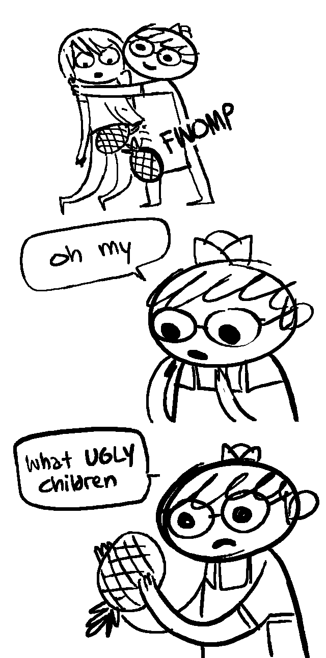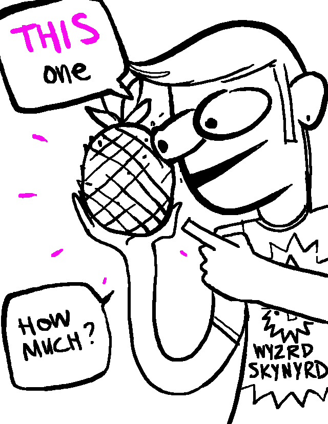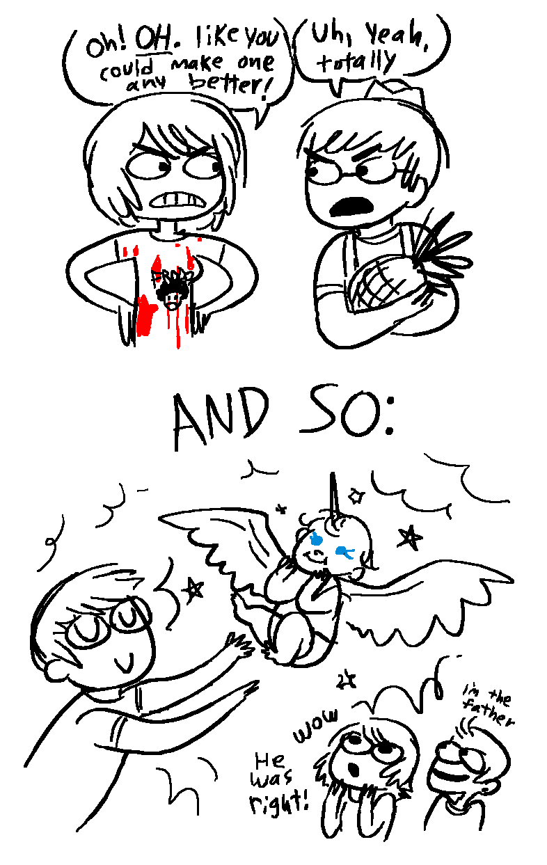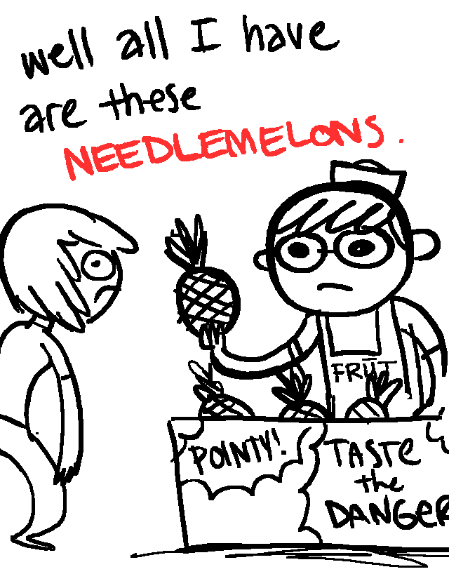 Hello! My friend Emmy and I drew a short back-and-forth comic. The topic was pineapple. Emmy drew the first one, I drew the second, etc. I think you should be able to tell them apart.