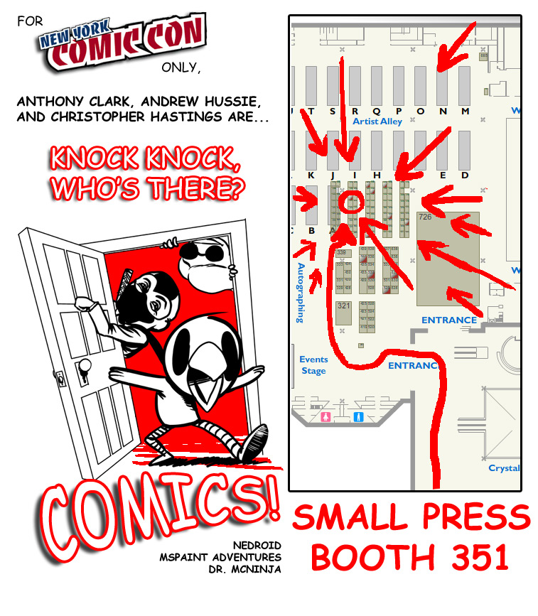 New York Comic Con is coming up on October 8! I’ll be there with Chris Hastings and Andrew Hussie. Chris drew this picture which contains relevant information: